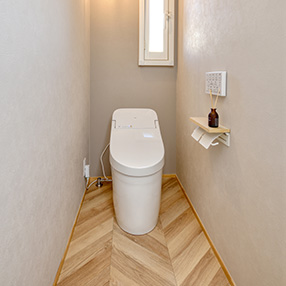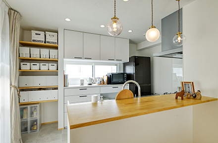 キッチンは白と木目を基調に、清潔感と温かみを兼ね備えた“家族のハブ”。調理をしながら会話が生まれ、夫婦や子どもたちが自然と集う空間に生まれ変わりました。収納力のある背面棚や効率的な動線が、忙しい毎日を軽やかにサポートします。
