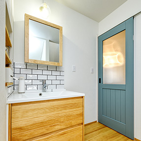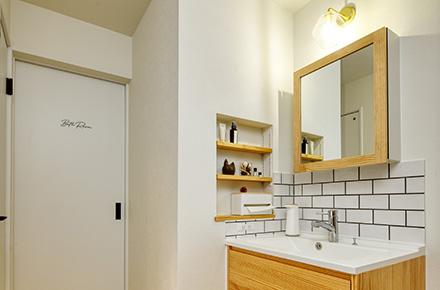 その流れを受けるように配置された洗面台は、木と白の調和がもたらす清潔感と心地よさが魅力。大きなミラーが空間に広がりを与え、充実した収納が家族の暮らしを整えます。朝の慌ただしい時間も、夜のリラックスタイムも快適に過ごせる場所になりました。