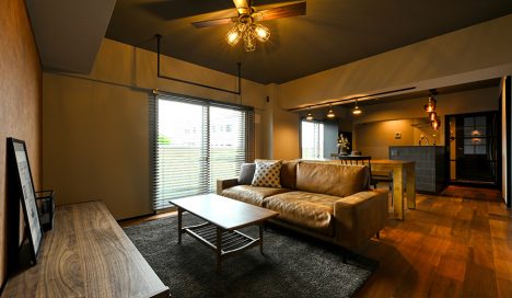 「マンションのコンパクトな空間ながらも開放感のある家にしたい。インダストリアルテイストにしたいが、男らしくなりすぎないのが良い。」とのご要望。空間のテイストはぎりぎりまでスロウカフェと悩まれていました。味のあるカフェのような空間で、ずっとそこでくつろげるようなものを望まれていたので武骨で王道のインダストリアルではなく、柔らかさもある雰囲気づくりを意識した空間に仕上げました。床材はホワイトオークからウォールナットへ変化し、それとともに曲線的な壁が空間の広がりや柔らかい印象を与えます。