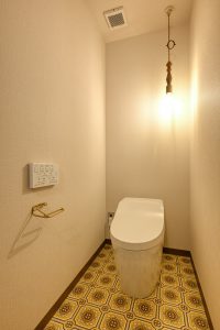 こちらのトイレは、壁紙はシンプルですが床と照明にこだわった空間です。
